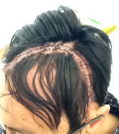 | 3日目 | 経口流動食が始まる。重湯とくず湯のようなドロドロしたもの。本当に食べ物なのか疑問を覚えたのでネットで検索して、どうやら食べ物らしいことを確認。栄養を取りたい一心で頑張って全部食べた。この後、流動食シリーズにいろいろな味があることが判明、くず湯風はイマイチ。 歩く練習して洗面所まで。 鎮痛剤は種類を変えながら一日中点滴で注入。それでも痛い。 | 頭の傷はふさがっている。風呂に入っても良いとのことで傷口をそっと洗った。。 傷の部分を中心に腫れている。 点滴が終了してアンプラグドに。 |