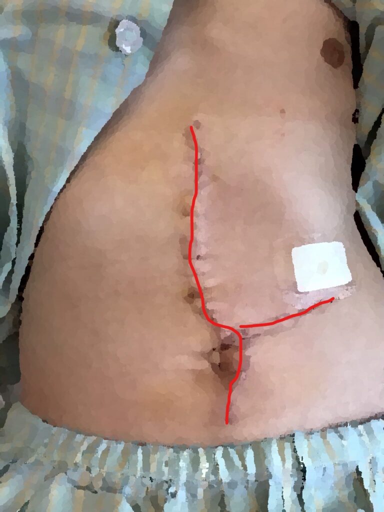 | 手術中 | 9:00~昼過ぎまでかかったと思う。 心電図や点滴や硬膜外麻酔などの準備以降は全身麻酔で記憶なし。 腫瘍のサイズが大きいため胸元からへその下まで縦に大きく切って、へその上から横にも切った。 腫瘍が胃や膵臓や大腸に癒着と浸潤があり、胃は剥がした、膵臓は削った、大腸は5cmを切断してつないだ。 | 9:00~16:30までかかった。 心電図や点滴や硬膜外麻酔などの準備から開頭までは全身麻酔で記憶なし。腫瘍の取り出し以降は意識あり。 脳内のナビゲーションシステムとか凄そうなマシーンを使って、手術室にはたくさんの人が付いてくれていた。主治医と助手の脳神経外科医、麻酔科医師、手術室看護師、言語聴覚士、理学療法士、臨床検査技師。医学生たちの見学もあり。 腫瘍を取りだす際は目の前の画面に映されたモノの名前をずっと声に出してしゃべる。その間に電気刺激を与えて除去部分を探る。電極が言語中枢に触れると全く言葉が出なくなるので、ちょっとでも言葉に詰まると言語療法士がストップをかけるというやり方。 |